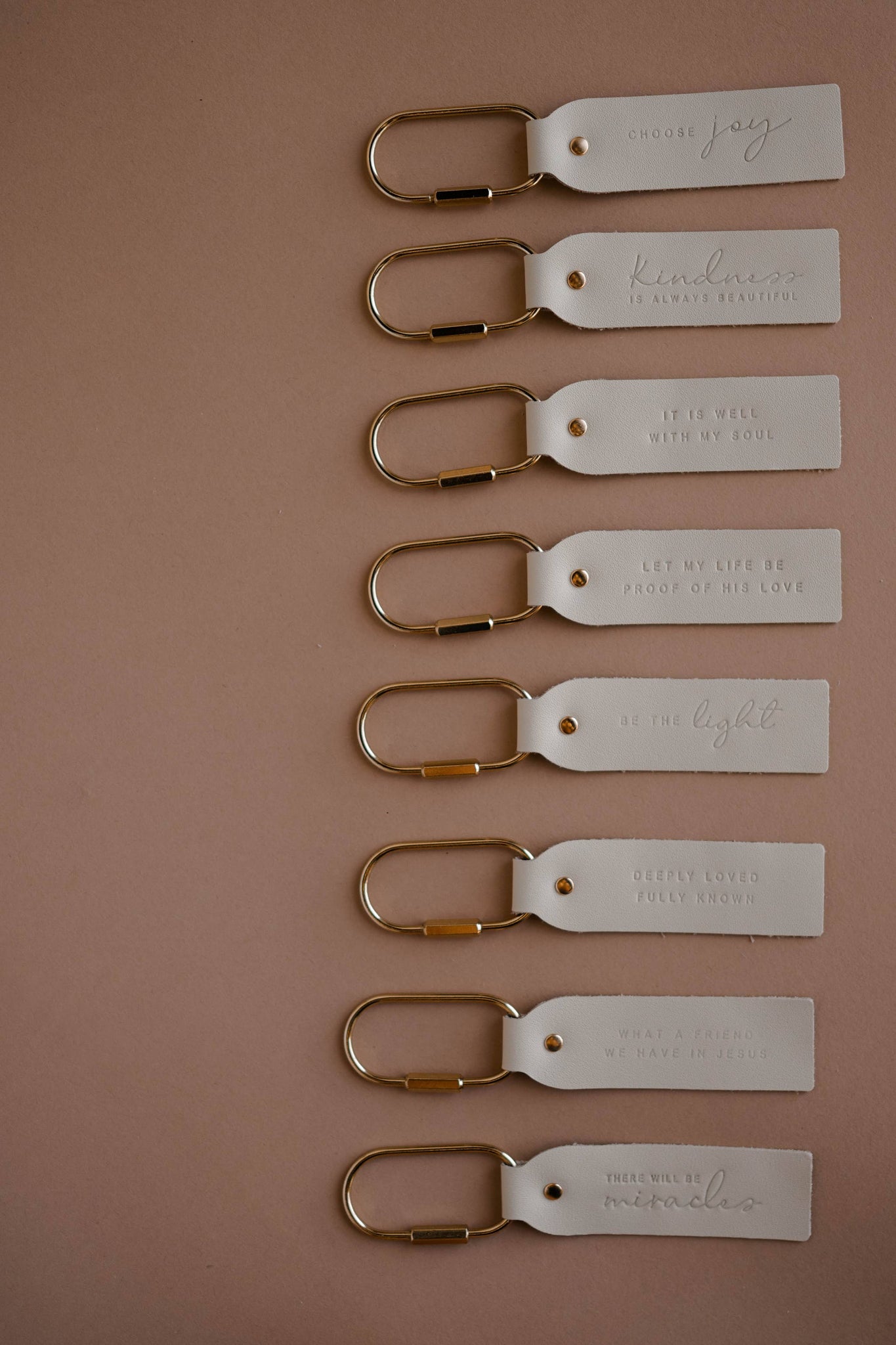 Encouraging words to keep with you on the go. Genuine Leather - Blonde Color 2" Carabiner 4" Wide Stamped Leather Fob